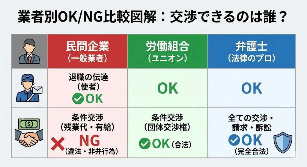 - 「労働組合」か「弁護士」を選べば、完全に合法で安全。